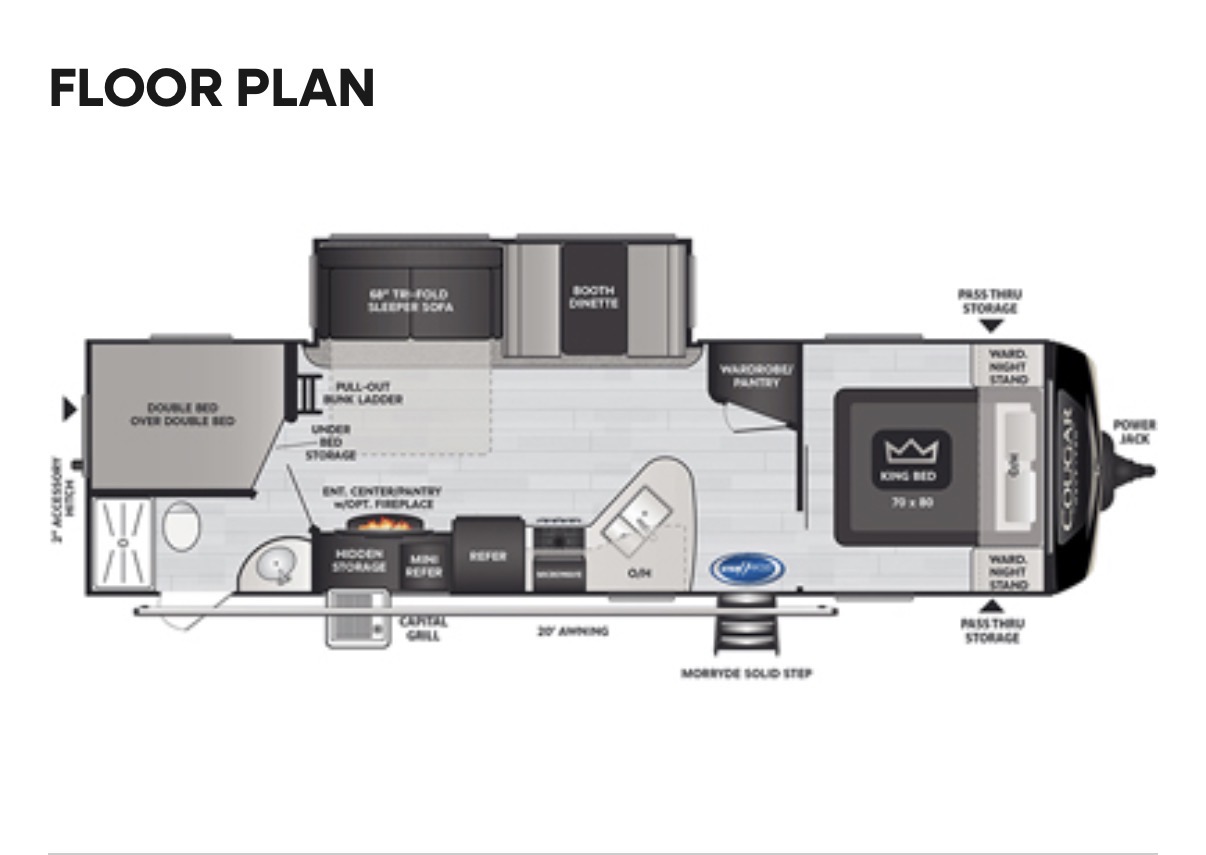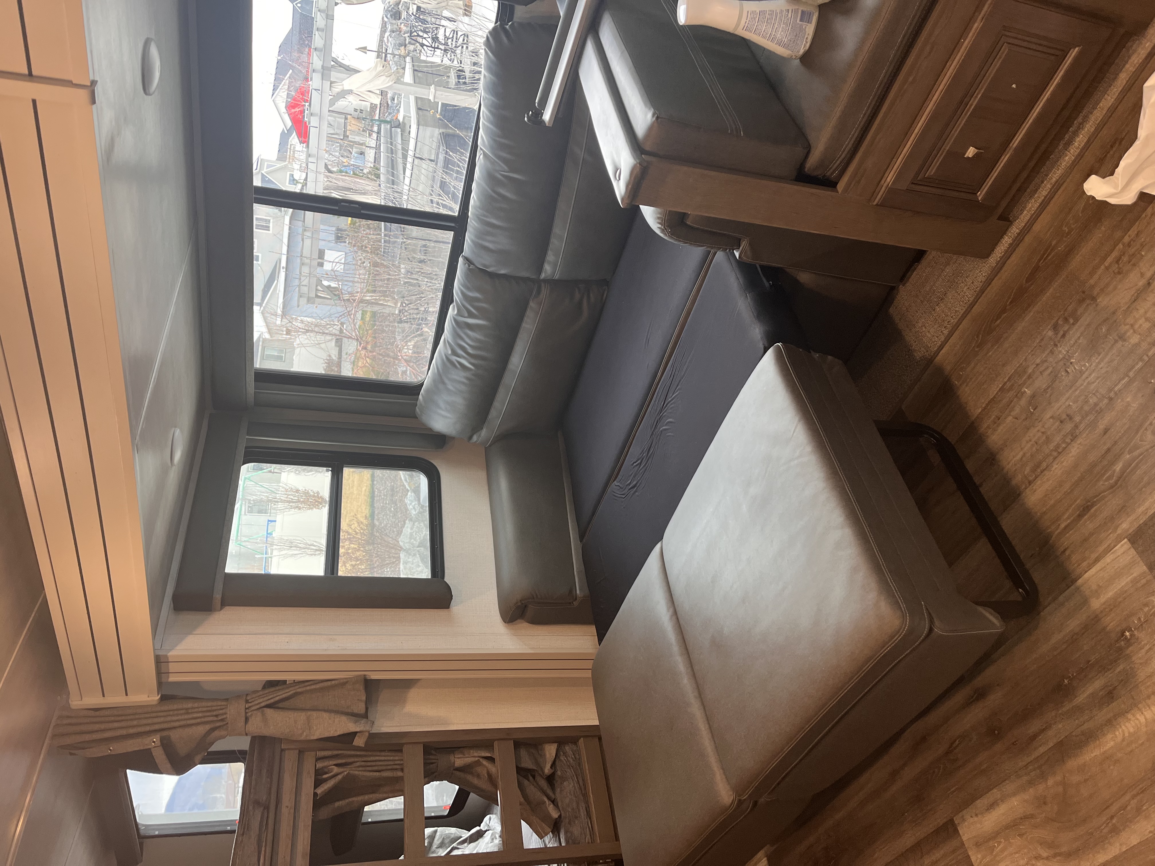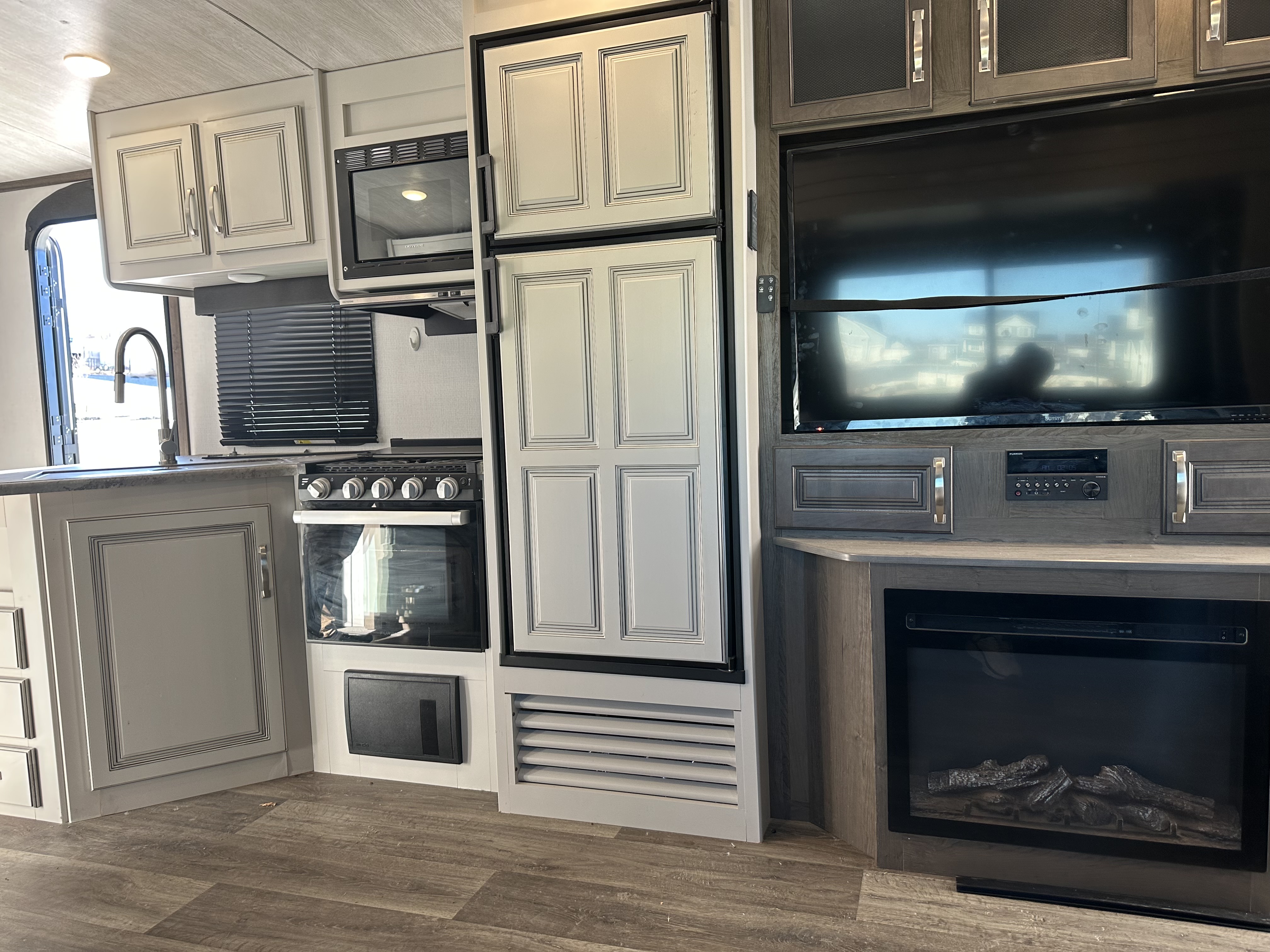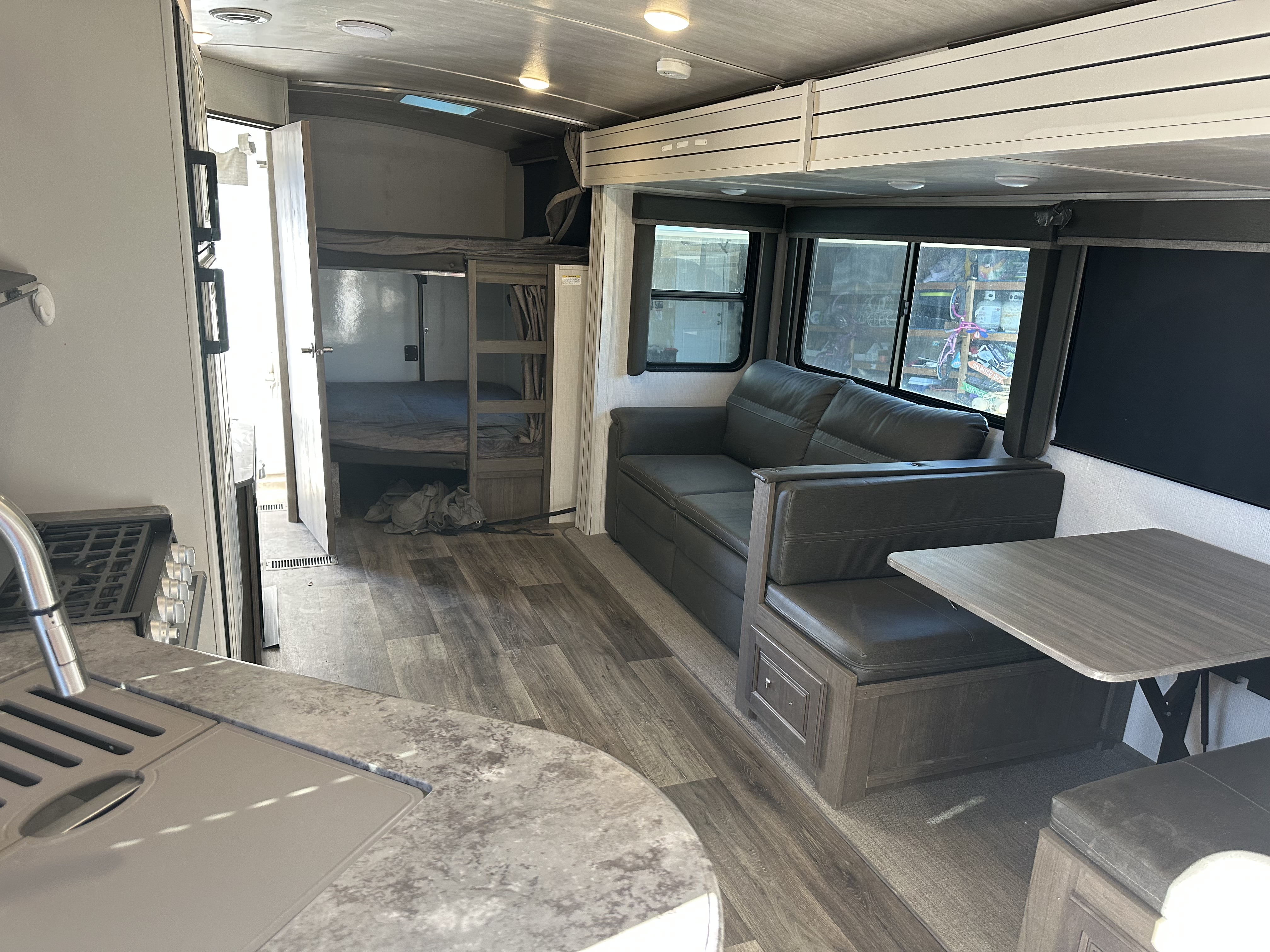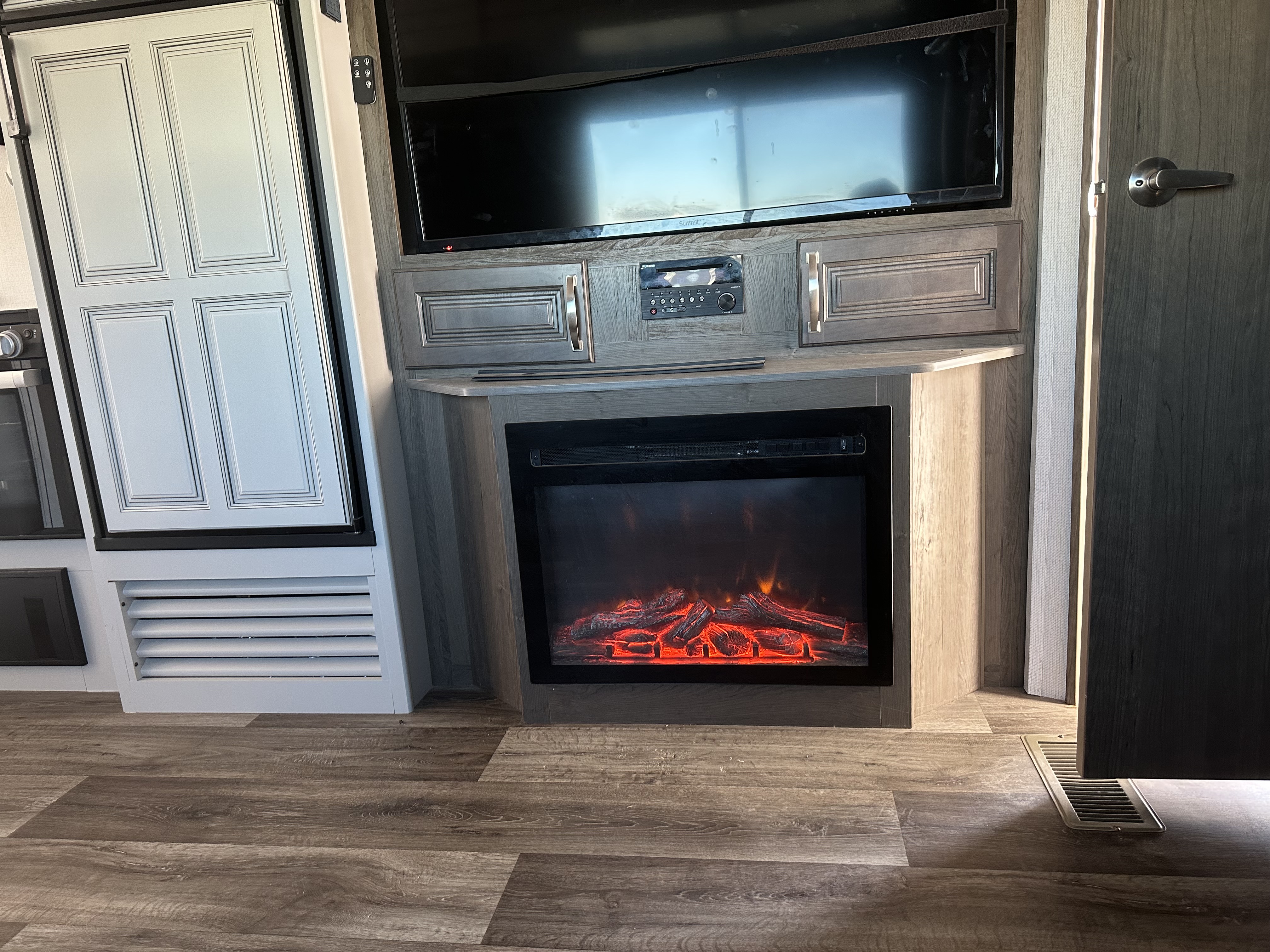 Kick back under the awning listening to your favorite tunes enjoy outside, enjoy cozy evening by the fireplace or settle in for a movie night with the TV/ DVD entertainment center. This trailer is comfort inside and out. With plenty of sleeping space, the couch folds out to a full bed, the bed, dinette also can go into a bed as well as big bunks with the top bunk (300lbs). The outside has our awning for shade LED lights, speakers and the outdoor kitchen makes it a great place for hanging out out. With its second door with direct access to the bathroom for convivence and makes it great to bring the kids, boots or whatever in for a clean up before going into the rest of the camper.